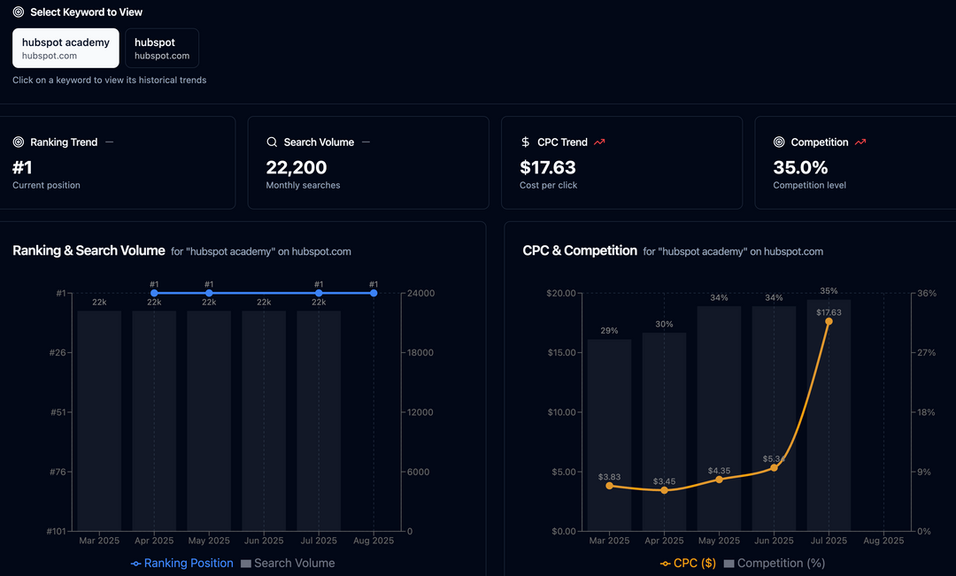Traditional SEO keyword volume, cost-per-click, competition, and rankings trending by month.